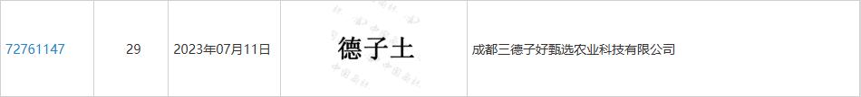 “德子土”商标详情(来源:中国商标网)成都三德子好选农业科技有限公司申请注册