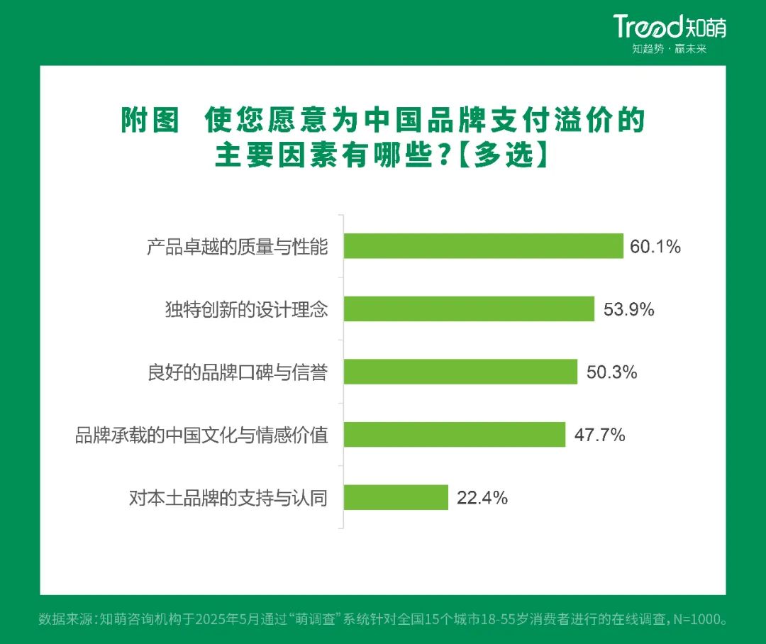 值得感受的因素是消费者愿意为中国品牌支付溢价的主要因素,包括优秀的质量和性能、独特的创新设计理念、良好的品牌口碑和信誉、品牌承载的中国文化和情感价值。