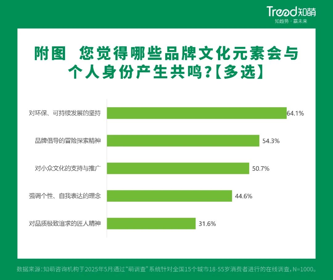 所以,那些能准确捕捉顾客情感需求,传递文化底蕴的品牌,通常会引起强烈的情感共鸣,使消费者产生“必不可少”的归属感。报告显示,品牌文化元素,如坚持环保可持续发展、倡导探索精神、支持小众文化等,有利于引起客户的共鸣。