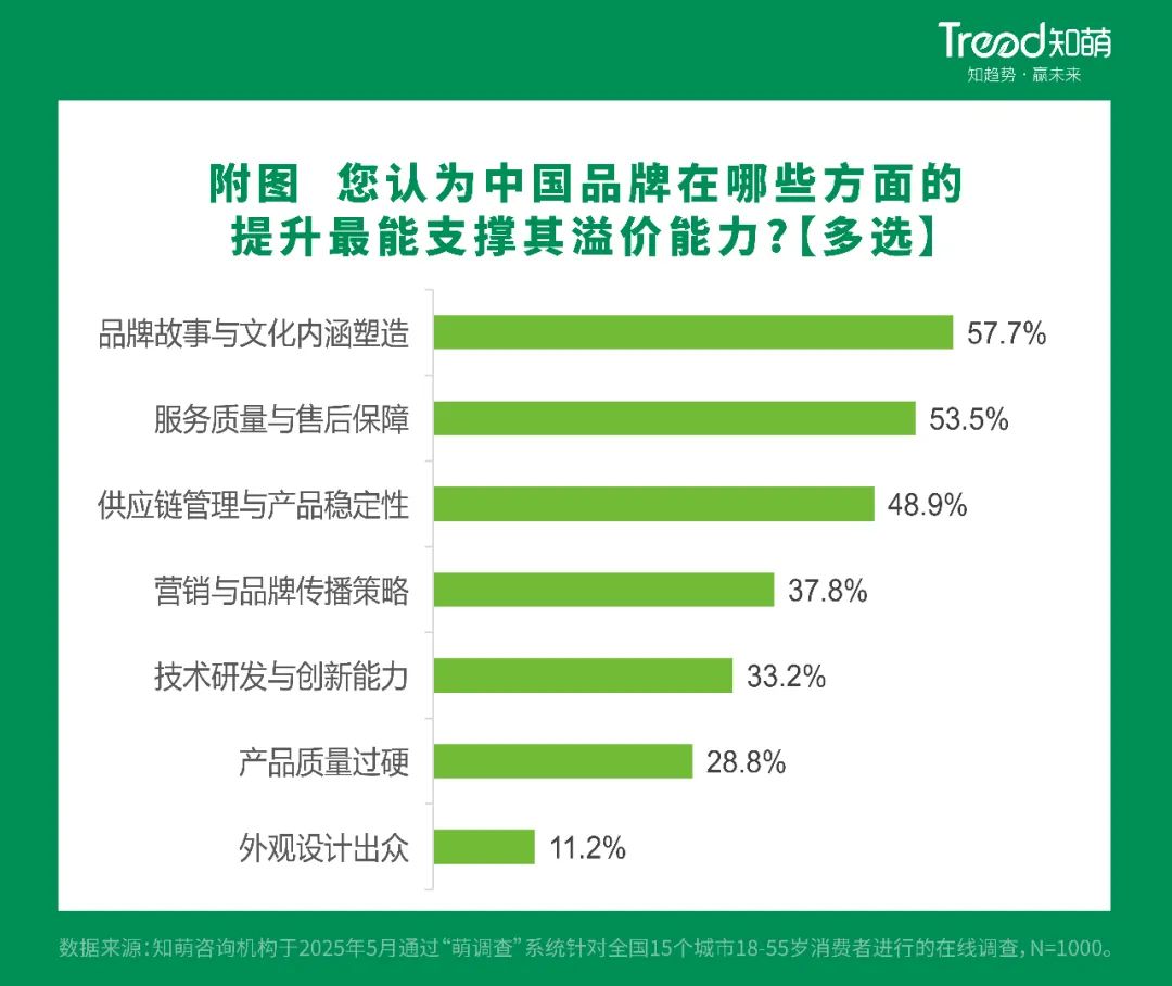 此外,消费者对品牌背后的故事和文化越来越重视。报告显示,57.7%的消费者认为,中国产品在提升品牌文化和文化底蕴方面最能支撑其溢价能力。