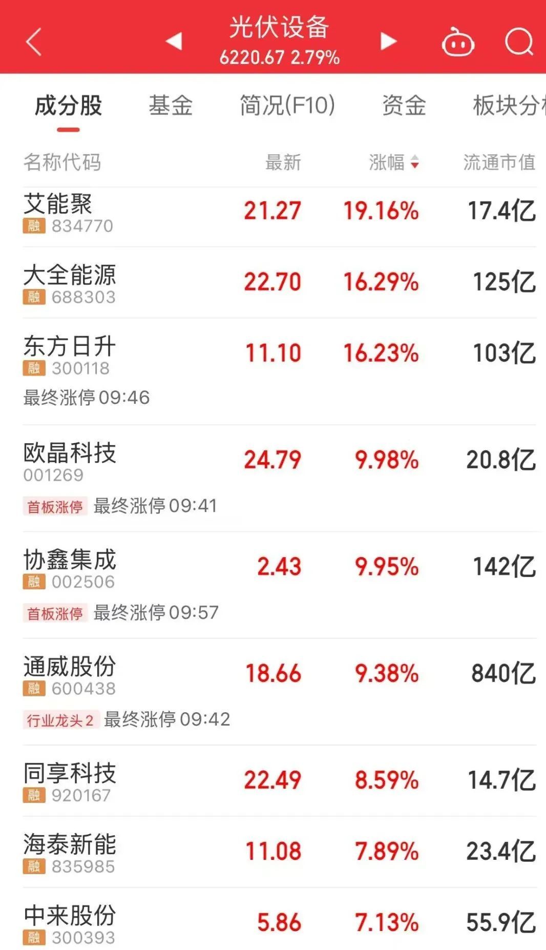 上午收盘,上证指数上涨0.08%,深证指数下跌0.24%,创业板指数下跌0.23%。光伏产业链上升,服装家纺、家居用品等板块上升。