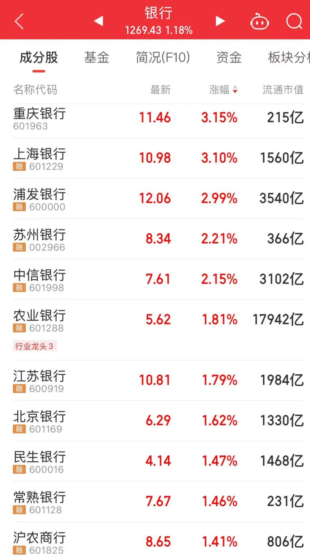 今早,银行板块上涨,板块内的股票没有一只下跌。