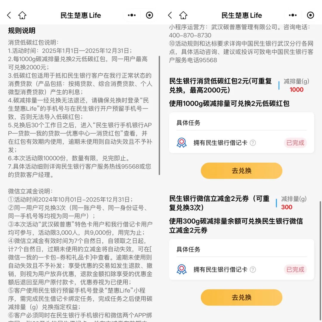 根据规定,2025年12月31日前,武汉市民通过公共出行、垃圾分类、低碳用电等11种低碳场景积累碳普惠减排量。减排量可以根据“1000克=2元”的标准兑换利息红包,同一用户最高可以兑换2000元,直接扣除抵押贷款、综合消费贷款和个人微型消费贷款的利率。