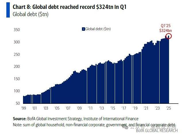 也就是说,如果市场不再愿意购买长期国债,导致利率飙升,可能会给债务链带来压力。如图所示,今年一季度全球债务总额创历史新高,达到324亿美元。在这种背景下,债券投资者集体“停止购买”只是时间问题。