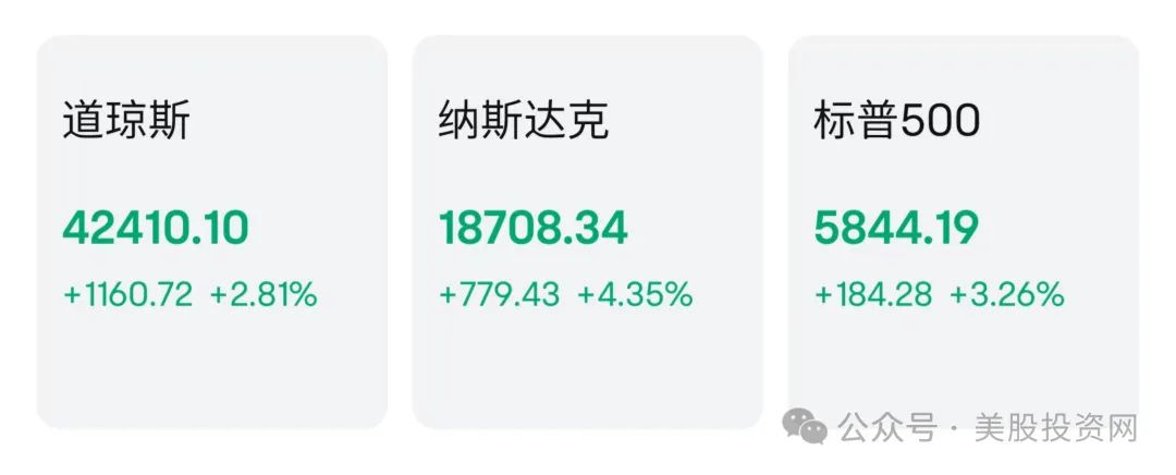截至收盘,美股三大股指均创下自4月9日以来的最大单日百分比。道指涨幅为2.81%,;纳指涨幅为4.35%;标准普尔500的涨幅为3.26%。