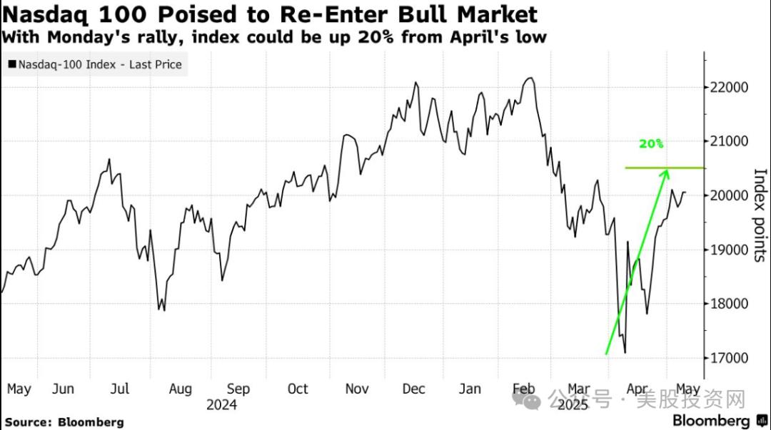 自4月份低点以来,纳斯达克100指数累计反弹近20%,接近技术牛市门槛。根据市场普遍定义,如果指数从最近的低点反弹超过20%,则视为重新进入牛市区间。