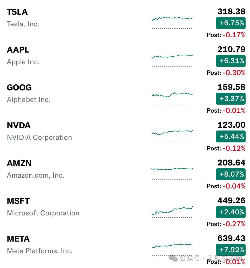 特斯拉的股票正在上涨 市值再次突破7% 1 亿美元。苹果上涨6.31%,亚马逊上涨8.07%,英伟上涨5.44%,微软上涨2.4%,谷歌母公司Alphabeta类股上涨3.74%。