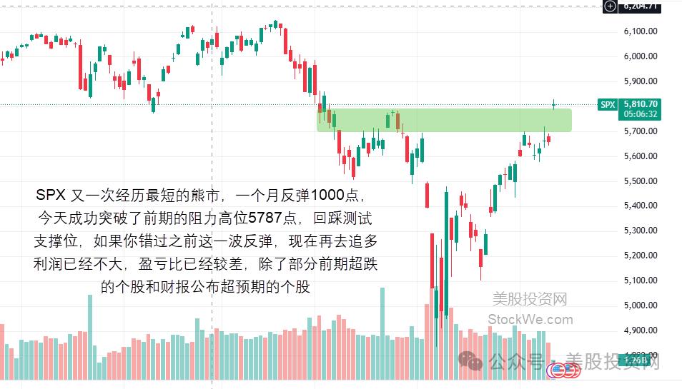 根据美股投资网的分析,SPX今天成功突破了之前5787点的阻力高位,回踩了检测支撑线。如果你错过了之前的反弹,现在追求更多的利润并不大,盈亏比已经很差了。希望等一些股票回调后再进入。 。
