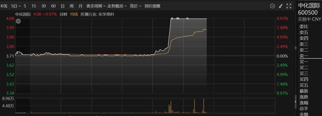 化工板块持续上涨,中化国际下午直线拉高涨停。长华化工、红墙股份、集泰股份此前涨停,联盛化工、七彩化工、江天化工、华融化工涨幅居前。