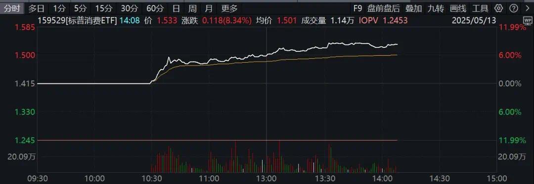 下午,景顺长城标普消费首选ETF一度上涨超过8%,溢价达到23.26%。