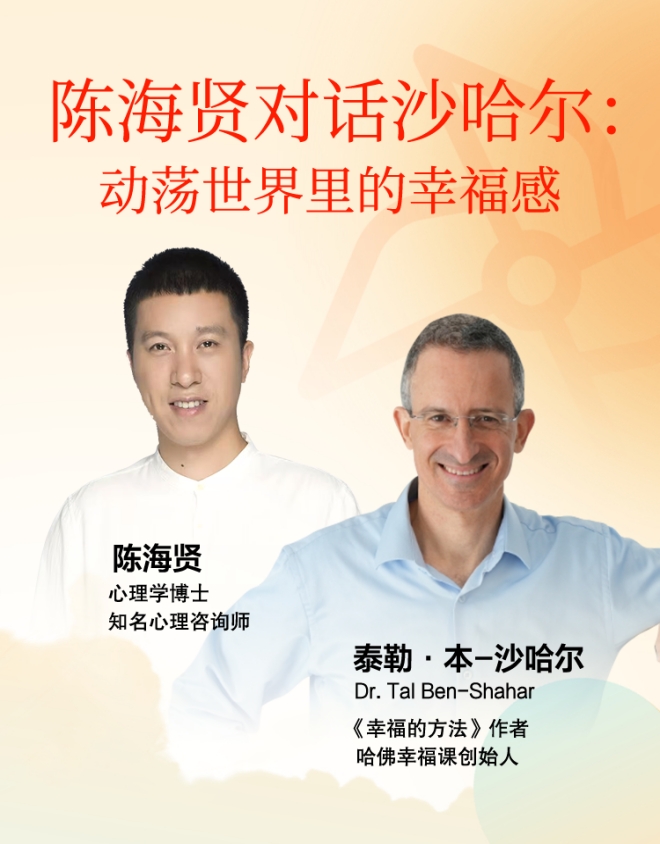 十几年前,当陈海贤蜷缩在大学宿舍里,反复看着泰勒·本-沙哈尔教授哈佛幸福课的视频时,他没有想到自己会在很多年后与这位“幸福传教者”进行跨国对话,听他讲述离开哈佛后的故事——这是一个关于勇气、困惑和再生的真实故事。