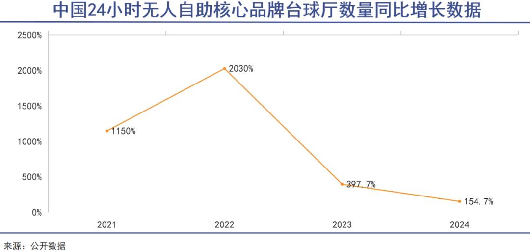 根据艾媒咨询数据,2022年中国24小时无人自助台球厅数量同比增长2030%,2024年仍保持154.7%的高速增长。