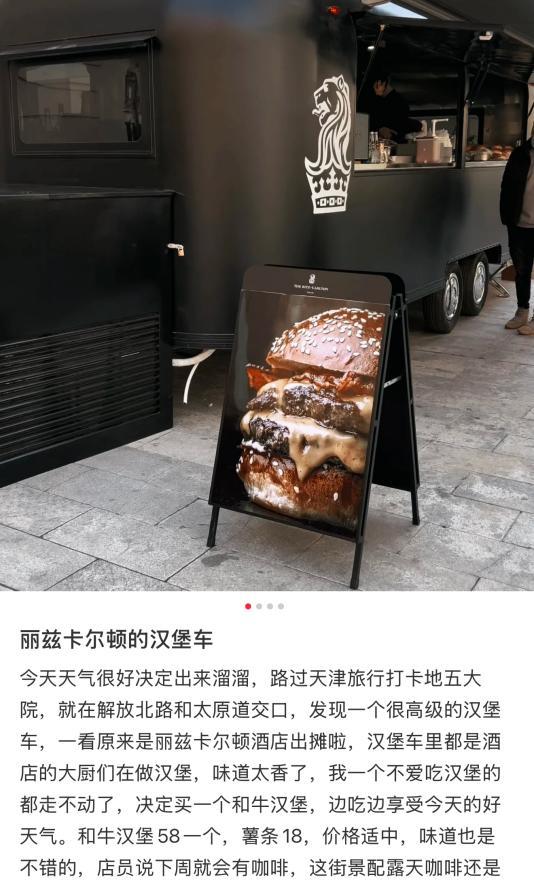 今年五一前,在天津五大道,丽思卡尔顿移动汉堡车吸引了不少游客。牛肉饼还不错,价格58元。虽然有点贵,但毕竟是“五星血系”。