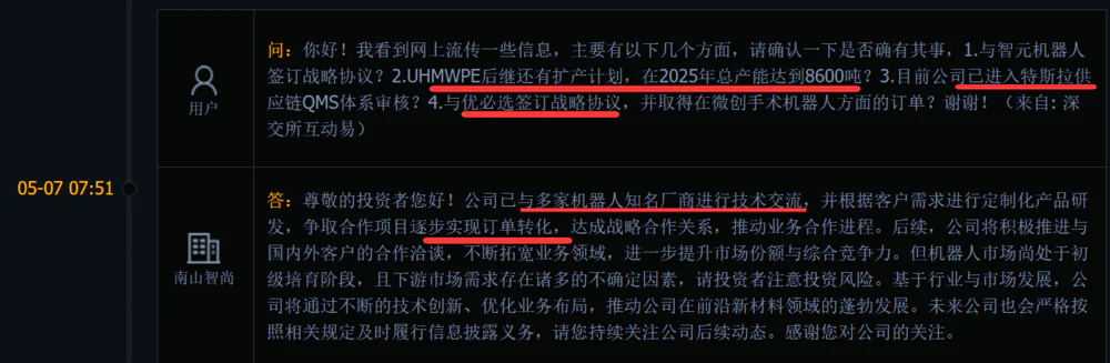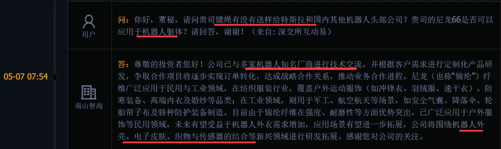 该公司拥有3600吨超高分子量聚乙烯纤维的生产能力和12条生产线。通过前期的大规模自主开发,具有技术领先优势,纤维质量和强度在中国排名第一。在投资者互动平台上,公司决定与多家机器人公司进行行业交流,并将扩展到电子皮肤和传感器领域。