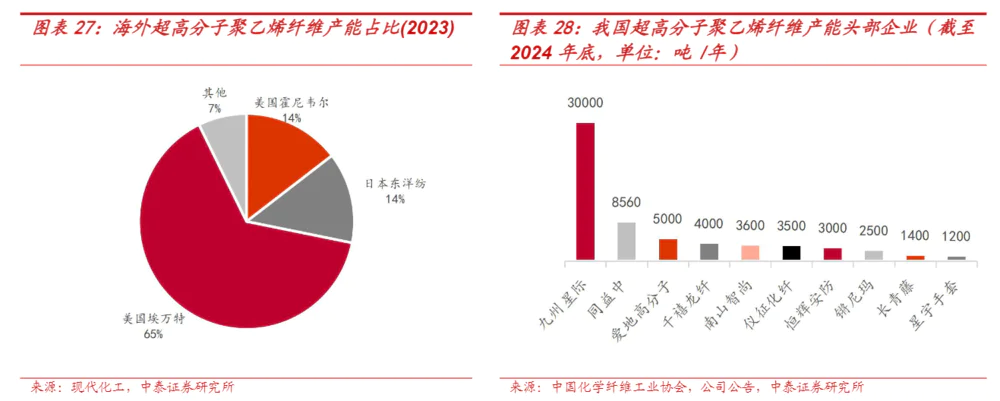UHMWPE纤维的大规模生产已经在全球范围内完成,包括荷兰、美国、日本和中国。根据现代化工公布的UHMWPE纤维现状及趋势,2023年海外UHMWPE纤维产能约为22,000吨/年。美国埃万特、美国霍尼韦尔和日本东洋纺约占海外UHMWPE纤维产能的90%,产能分别为14200吨/年、3200吨/年和3000吨/年。