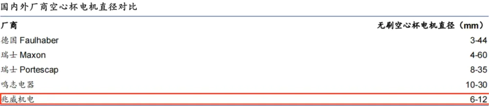 国外厂家空心杯电机品类齐全,Faulhaber、maxon空心杯的直径可以小到3-5mm,国内厂家很少有12mm以下的空心杯电机。目前,兆威机电有限公司是国内为数不多的可以生产直径小于10mm的电机的厂家之一,目前直径达到6-12mm,兆威已经在开发4mm的电机,有望打破垄断。
