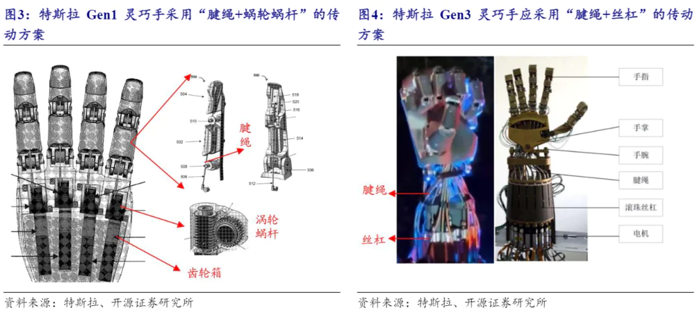 全新Gen3的特斯拉Optimus机器人灵巧手选择“齿轮箱箱” 丝杠 腱绳的传动方案,一级传动采用行星齿轮箱,二级传动通过丝杠提供高精度的线性传动,三级传动通过腱绳连接手臂模块和手指。