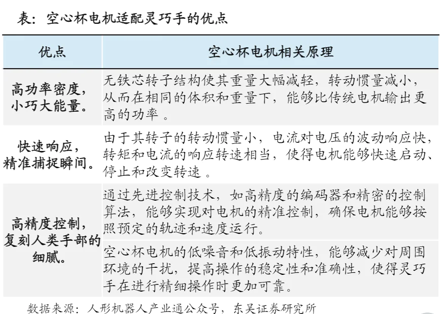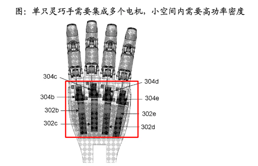 机器人灵巧的手结构简单,需要在有限的空间内集成多个电机,从而实现多个手关节的灵活性,扭矩的大小决定了手指关节的抓握力。因此,高功率密度的电机(输出功率在有限体积内增加)应该是灵巧的手动驱动单元的首选。