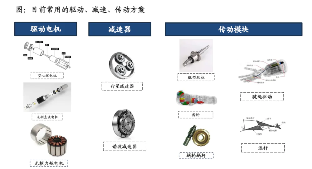①驱动模块:电机驱动是目前灵巧手的主流驱动方案。空心杯电机、无刷DC电机、无框扭矩电机都有应用。目前,空心杯电机是主流方案。