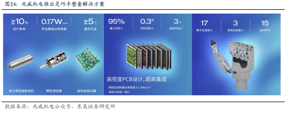2024年11月14日,基于电机减速器等核心部件的自主生产能力,兆威机电正式推出了其手指集成驱动的高可靠灵巧手。这款灵巧的手机有17个主动执行单元,单个手指的自由度大于或等于3个。整只手的关键部件都是自主开发的,包括电机、减速器、控制器等。,其中高效高功率传动模块的设计寿命高达10年。