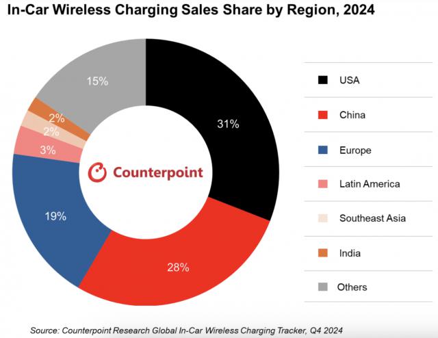 Counterpoint Research 报告显示,美国仍是世界上最大的汽车无线充电市场,市场份额高达 31%;随之而来的是中国和欧洲市场,其中比例分别为 28% 和 19%。凭借庞大的消费量和快速的技术迭代,中国市场呈现出强大的增长潜力。