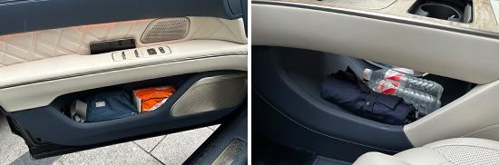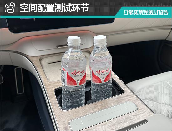 对车内使用空间的检测,仅针对前排触手可及的空间,不包括手套箱、中央扶手箱等需要启动的空间。测试方法是将以下所有固定物品放置在前排的每一个储物空间中,通过固定物品的放置状态来判断车辆储物空间的性能。检验选定的固定物体如下:2 一瓶常规大小的矿泉水, 大屏幕手机,1 支口红、1 个挎包、1 副墨镜、1 把折叠伞和 1 包装常规尺寸的抽纸。