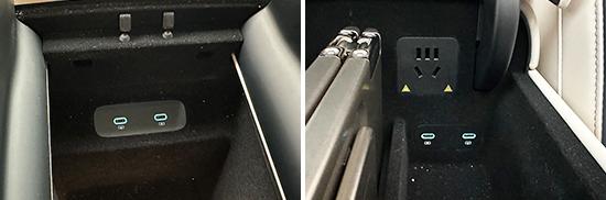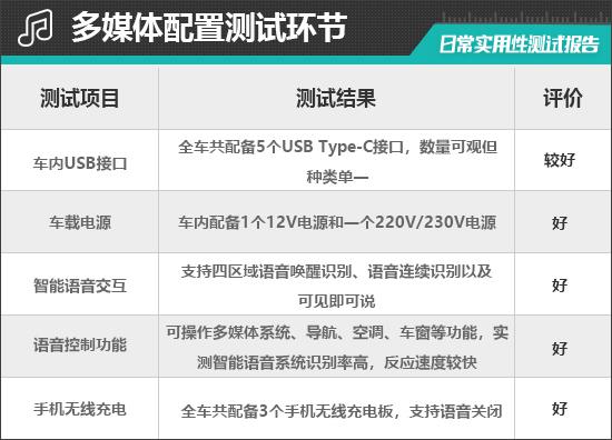 对整车进行评估 5 个 USB Type-C 接口,虽然数量可观,但是类型比较简单,没有配备。 USB Type-A 接口。然而,评估车的第二排提供了 220V/230V 电源,基本能满足车内乘客多种电子产品的用电需求。