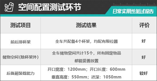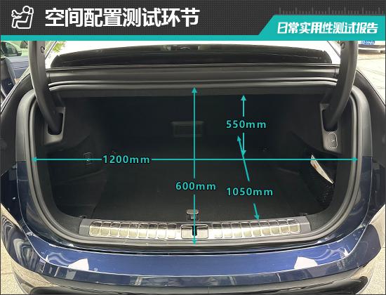 对评估汽车后备箱的基本值,我们也进行了实测,张口长度为 600mm;张口宽度为 1200mm;后备箱进入深度 1050mm;后备箱台与上面的垂直高度为 550mm。