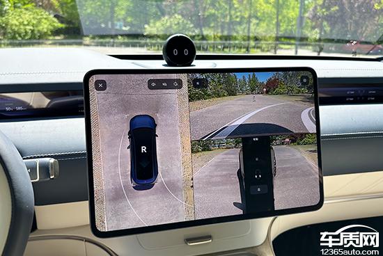 评估车辆的配置 360 全景图像,实测整体画质清晰度好,无异常。同时,图片支持多角度查看,并配有可随动转向的倒车辅助线,帮助驾驶员更容易完成倒车等操作,实用性能符合预期。