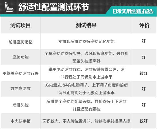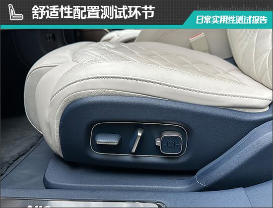在舒适性配置方面,评估汽车前排座椅的调整按钮位于座椅的左右两侧,位置合理,操作方便。同时,前后座椅支持座椅记忆功能。此外,全车座椅还支持加热、通风和按摩功能,并配备头枕扬声器,舒适性令人满意。