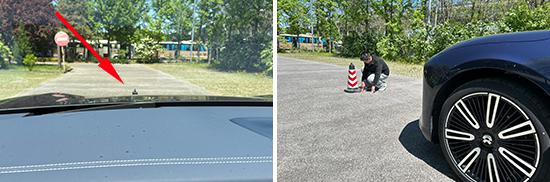 我们采用高度高度来测试前方视野阶段。 70cm 以桩桶为参考,然后调整车距,直到主驾驶座可以看到桩桶的上缘。经过测试,桩桶和车前最后测量的数据是 在测试过的同级别车型中,2.455m处于中游水平。
