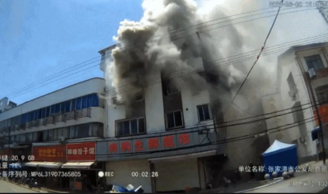 2022年6月8日,江苏张家港市沿街5层楼高的建筑着火,位于3楼住宅区。