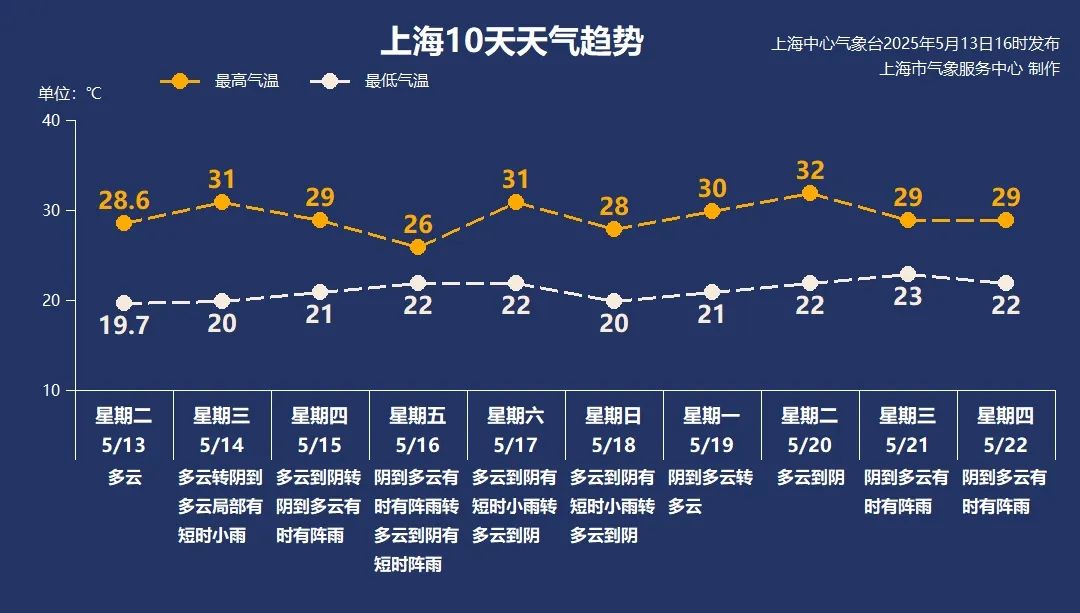 受降雨影响,周五最高气温下降至26℃,其余时间最高气温在28~31℃之间,体验偏热,最低气温保持在21~22℃之间。气候意义上的夏天已经到来。