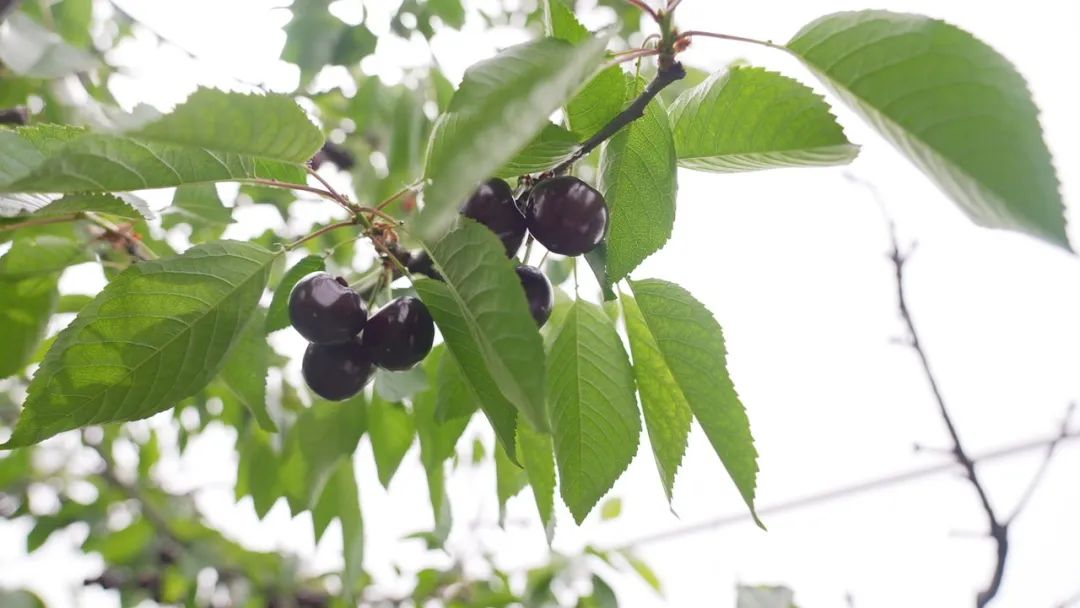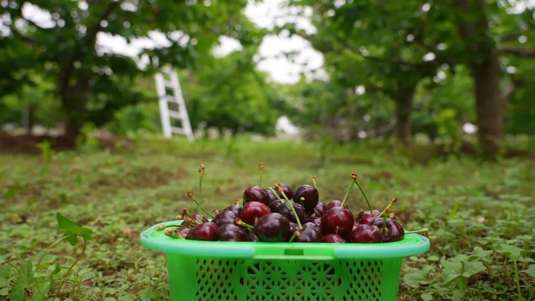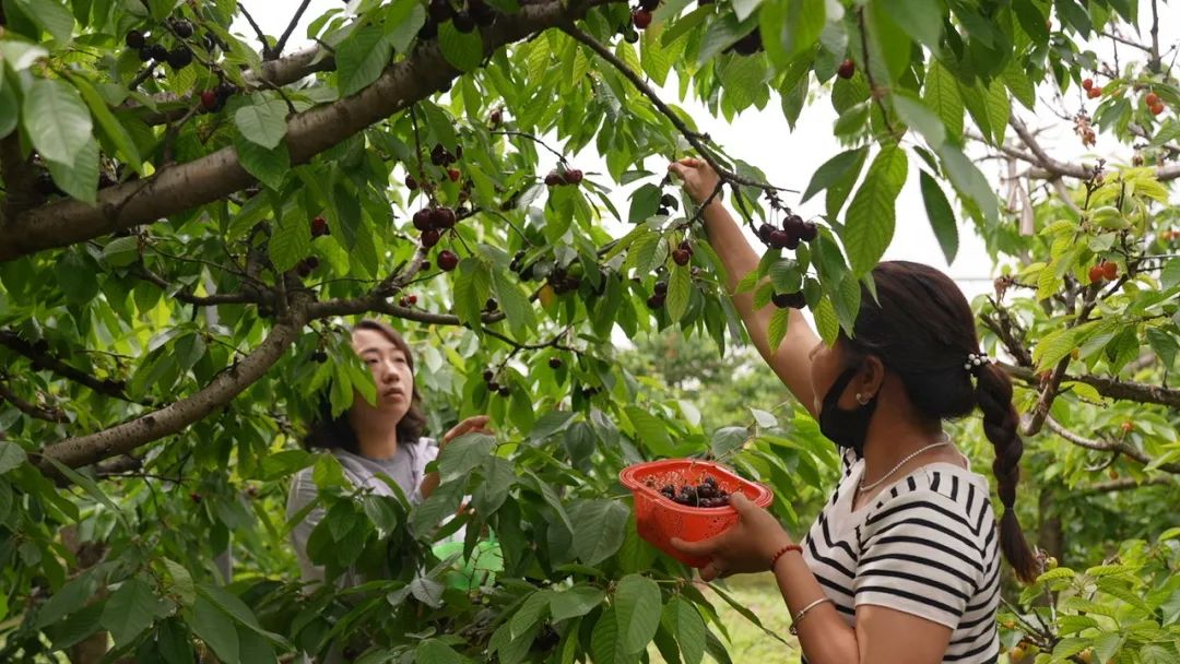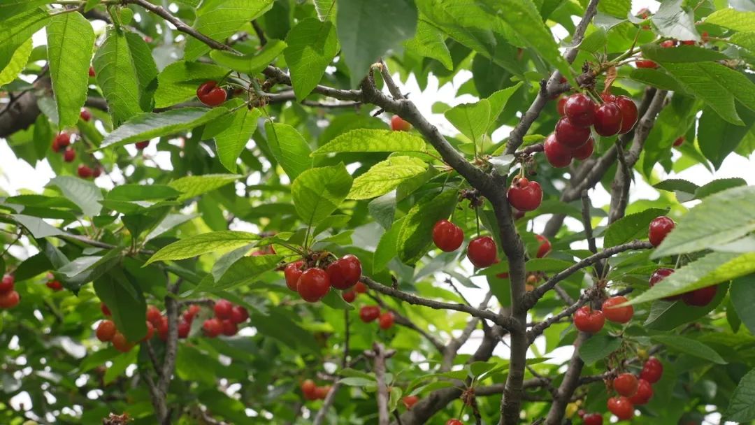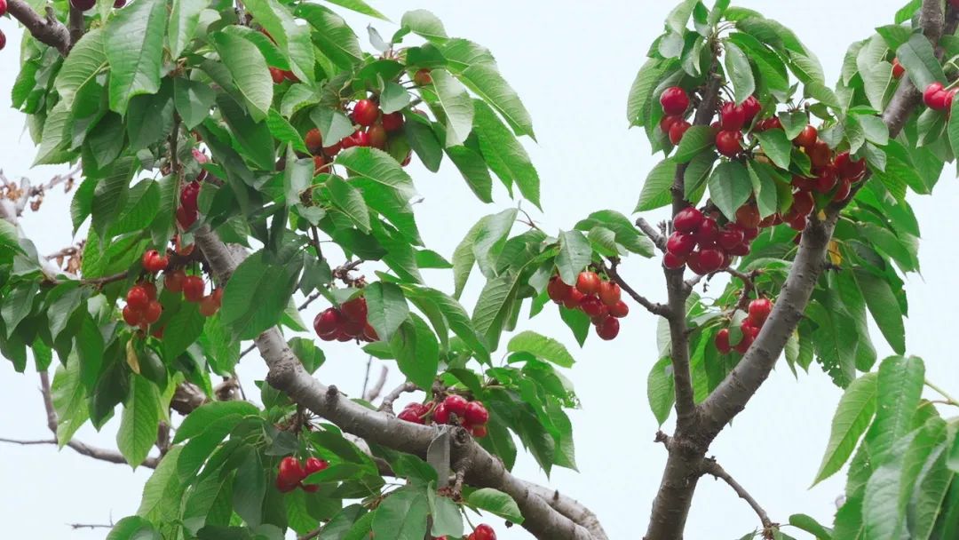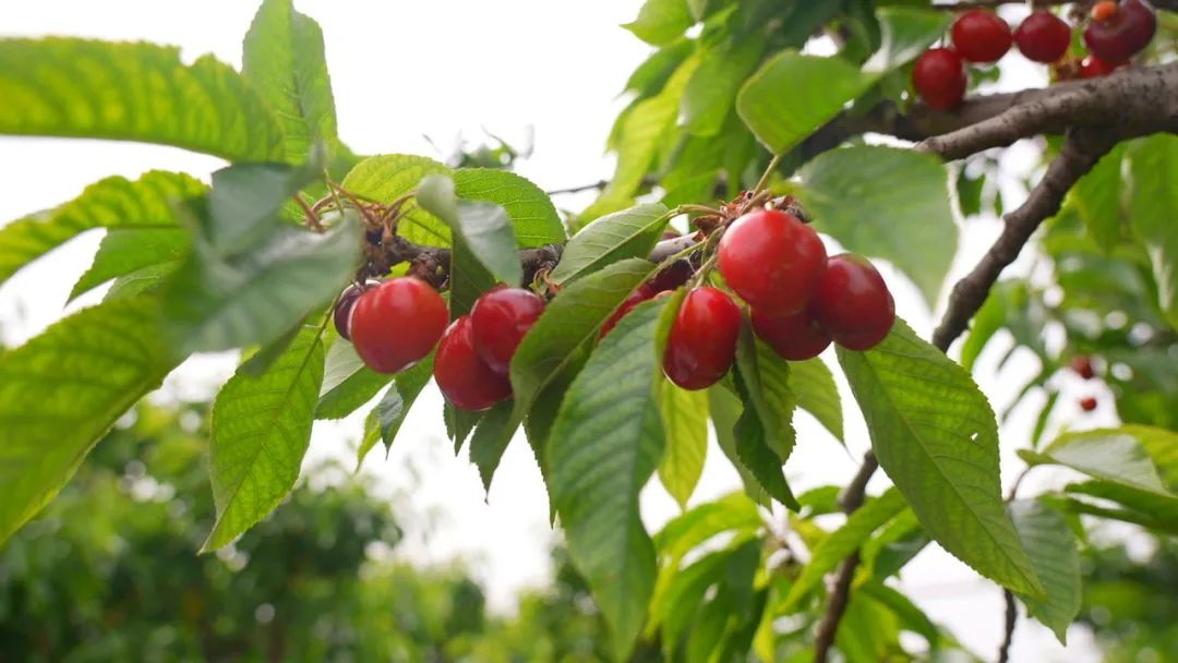 一簇簇晶莹圆润的樱桃挂在枝头。