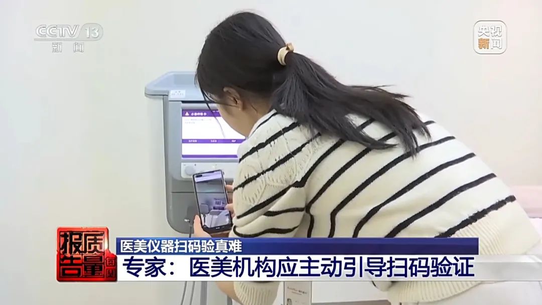 记者随机选择了一些价格在1万元以内的美容机构,在浙江、江苏、湖南等地进行射频治疗。在其中一家医疗美容机构,记者扫描仪器上方的二维码,显示错误的代码。顾问告诉记者,“这个代码贴在设备上是为了应对客户扫码”。