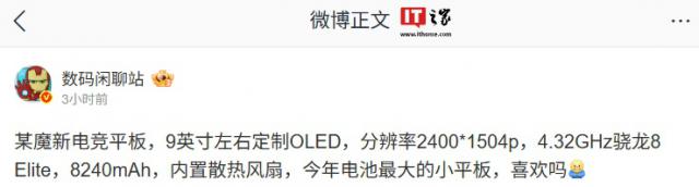 IT 世家 5 月 14 每日新闻,博主 @数码闲聊站 今天发文透露,红魔新电竞平板配置 9 上下定制英尺 OLED 屏幕(分辨率 2400*1504p),搭载 4.32GHz 骁龙 8 Elite Cpu,内置冷却风扇,同时也是今年电池最大的小平板。