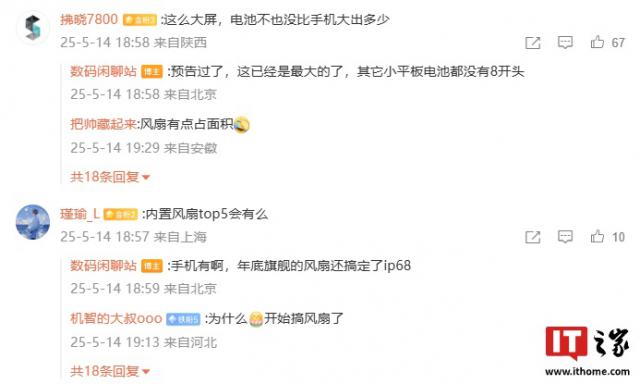 在评论区,博主们还回复了一些网友的提问:针对新平板电池不够大,他说:“预告过了,这已经是最大的了,其它的小平板电池也没有 8 开头";针对 Top5 制造商是否会推出内置风扇的新产品,他指出“手机有啊,年底,旗舰风扇也搞定了。 IP68 "。