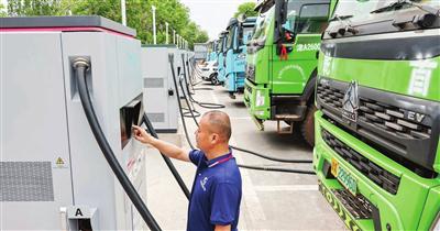 重型卡车在北疆地区公共充电站充电。 记者 吴迪 摄