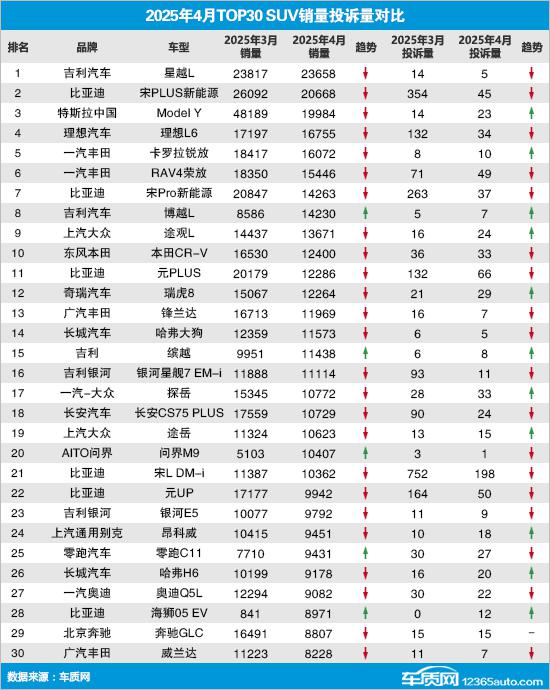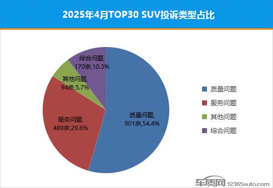2025年4月TOP30 对应于SUV销售投诉量的评估。