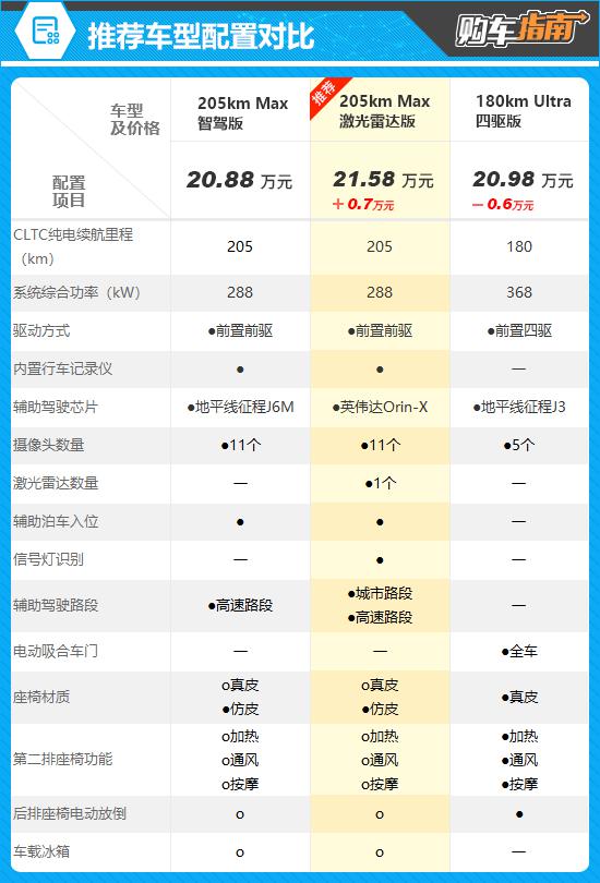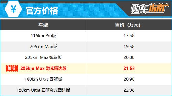 180km Ultra 与推荐车型相比,四驱版增加了一台后置单电机,系统综合功率有所提高。配置增强了整车的电动吸合门,同时,第二排座椅加热。 / 通风 / 后排座椅的按摩和电动放倒功能由选择变为标准,价格也下降了。 0.6 万元。但是考虑到这一功能只是锦上添花,日常使用次数不高, CLTC 纯电池续航里程明显下降,客户关注的激光雷达也没有提供,所以不推荐。