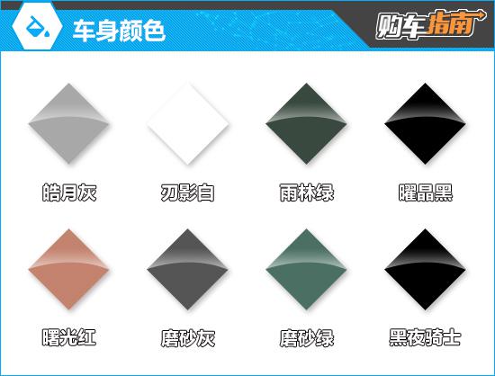 在车身颜色方面,全系列车型提供五种基本颜色:黑曜石晶体黑色、刃影白色、明月灰色、曙光红色和雨林绿色;同时还提供夜骑士(黑夜骑士个性色绑定黑曜石晶车漆,20。 英尺熏黑轮毂及外饰熏黑套件)、磨砂灰、磨砂绿三种个性颜色及刃影白 / 黑、曙光红 / 黑、雨林绿 / 黑色三种双拼色。值得注意的是,个性和双拼色都要花钱选择。