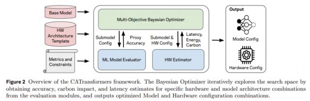 Meta 的 FAIR 由佐治亚理工学院联合推出的团队 CATransformers 框架,将碳排放纳入核心设计考虑。该框架通过多目标贝叶斯优化引擎,共同评估模型架构和硬件加速器的性能,平衡延迟、能耗、精度和总碳足迹。