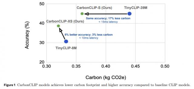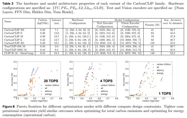 尤其针对边缘推理设备,CATransformers 大规模修枝 CLIP 结合硬件估算工具,模型生成组合,分析碳排放和性能。其成果 CarbonCLIP-S 与 TinyCLIP-39M 虽然精度相当,但是碳排放减少了 延迟保持在17% 15 ms内;CarbonCLIP-XS 则比 TinyCLIP-8M 精度提高 碳排放减少8% 延迟低于3% 10 ms。