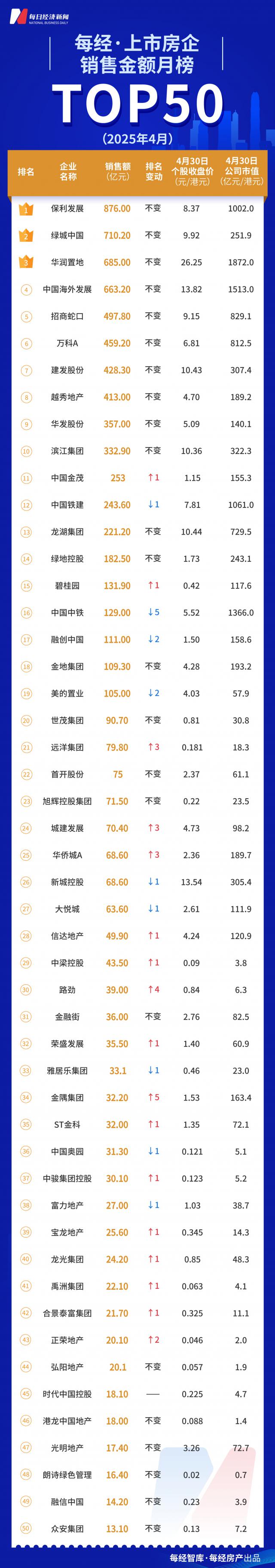 截至 4 月底,销售额 TOP10 房地产企业排名没有变化。中国金茂与中国铁建交换排名,远洋集团、城建发展、华侨城、路劲、金隅集团排名明显上升,中铁、融创中国排名略有下降。