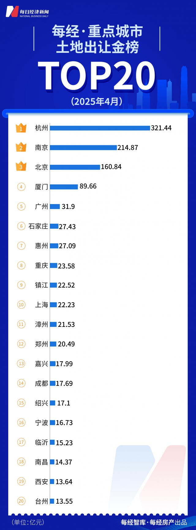 4 月核心城市土地市场依然火爆,北京、杭州、成都等热点城市高溢价地块频繁出现,杭州、南京、北京是土地出让金的前三大城市。