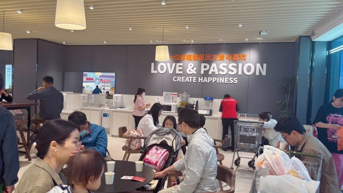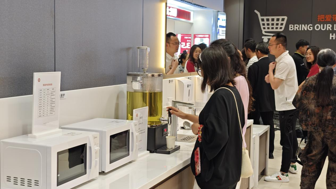 在所有调整店,服务粒度细化到每个触点:取消强制动线,拓宽通道,“矮化”货架,提高通透性;增加放大镜和湿手器;宠物储存、母婴室、血压仪等便民设施覆盖整个场景;提供免费花茶和1小时免费充电宝服务,配备桌椅、洗脸台、微波炉等。可供用餐,方便顾客购买商品后随时食用。