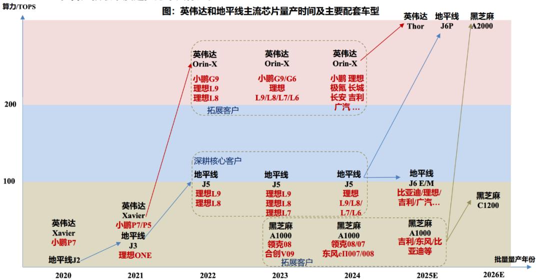 英伟达在2022年率先进入商品迭代周期(Xavier->OrinX),2025年后,国产芯片和英伟达正式进入同级竞争阶段。经过五年的追求,国产芯片在量产验证和客户获取方面逐渐打平了英伟达。
