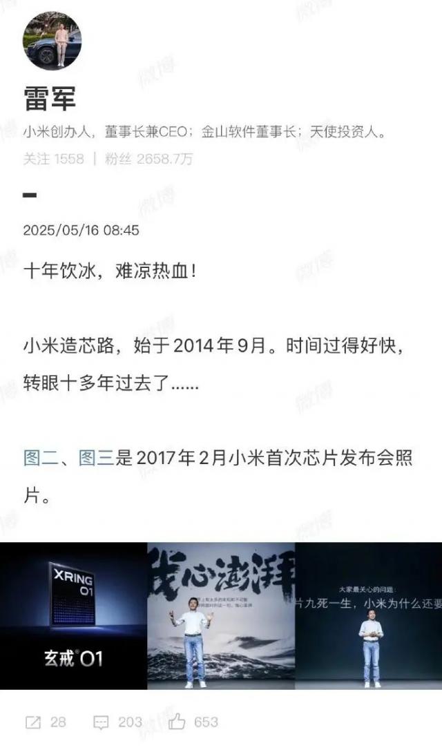 5 月 15 日本,小米创始人,董事长兼董事长 CEO 雷军在微博上发文称,小米自主开发设计的手机 SoC 名为玄戒的芯片 O1,即将在 5 月底发布。