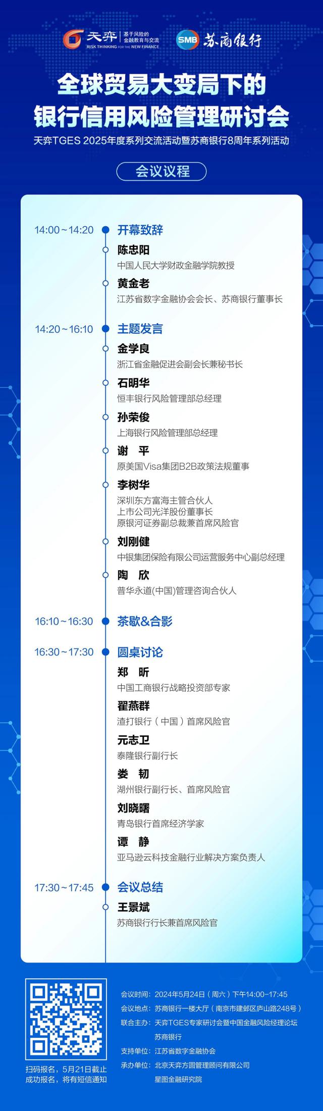 当前,全球经济和金融形势面临的不确定性加剧,银行风险管理也面临着巨大的挑战。5 月 24 日本,苏商银行,天游 TGES 金融风险管理领域的专家学者和代表性金融企业,由专家研讨会暨中国金融风险主管论坛主办,江苏省数字金融协会支持,星图金融研究院、北京天弈方圆管理顾问有限公司承办,全球贸易大变局下的银行信用风险管理研讨会。为了促进银行信用风险管理,我们将深入探讨银行业务和信贷风险面临的困难和风险管理的应对措施。