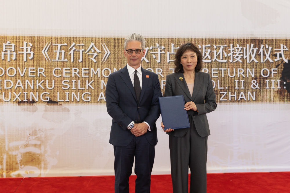 当地时间5月16日,国家文物局首次在中国驻美国大使馆收到美国史密森学会国家亚洲艺术博物馆返回的子弹库丝绸书《五行令》和《攻守占》,将于今年7月在中国中国博物馆举办的“万里同归-新时期文物追索退还成果展”上向公众展出。